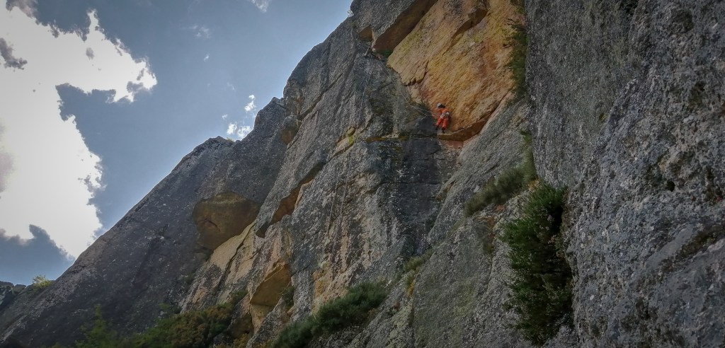 Una sorprendente y divertida escalada que supera en su primer largo una placa fisurada (preciosa escalada) semiequipada, para más tarde ascender por un marcado diedro de canto generoso. Otra de las buenas.