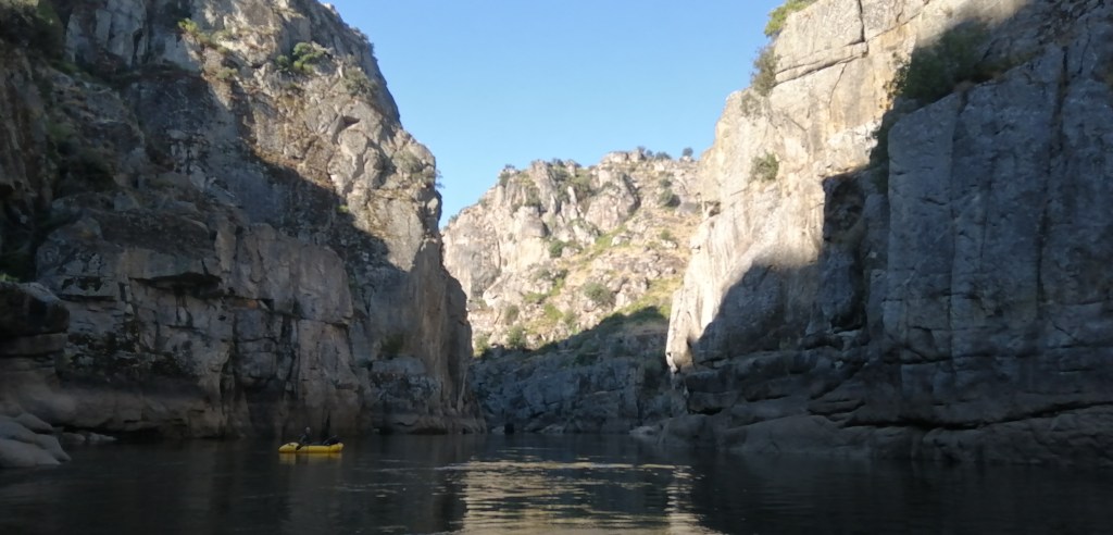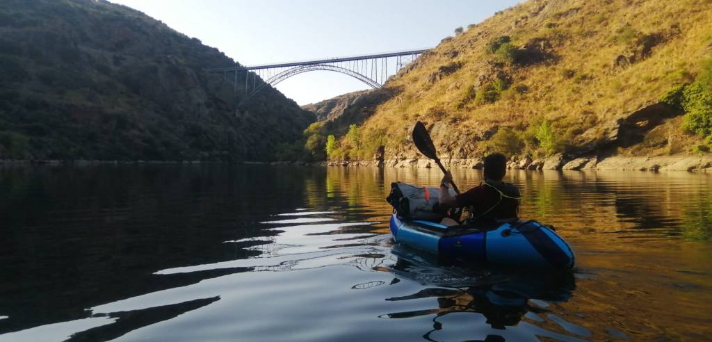 A escasos metros de los muros de la presa de Bemposta, lugar en donde terminamos ayer, empezamos el descenso con una fuerte corriente. No es debido al turbinaje de la presa (pese a oscilar el nivel del agua varios metros de un día a otro), sino al aporte de agua fría del ya mencionado río Tormes, lo que aprovechamos para aumentar notablemente nuestra velocidad de crucero ya que, el Packraft tiene de positivo ser una embarcación sumamente ancha y estable, pero por contra, esto hace que sea sumamente lento en comparación por ejemplo con una piragua de río o un kayak de mar. Todo viento de popa y corriente río abajo es siempre bienvenida. Sin embargo un viento o corriente en contra puede mermar nuestra velocidad media de 2 a 4 Km/h. Para que os hagáis una idea, con una lámina de agua plana, podemos navegar con los barquitos de plástico a una media de 4.5 km/h, con corriente a favor entre 6 y 10K/h (todo depende de la fuerza del agua o del viento) y cuando tenemos la mala suerte del viento en contra bajamos a 1.2 o 2Km/h, amén del dolor de brazos.