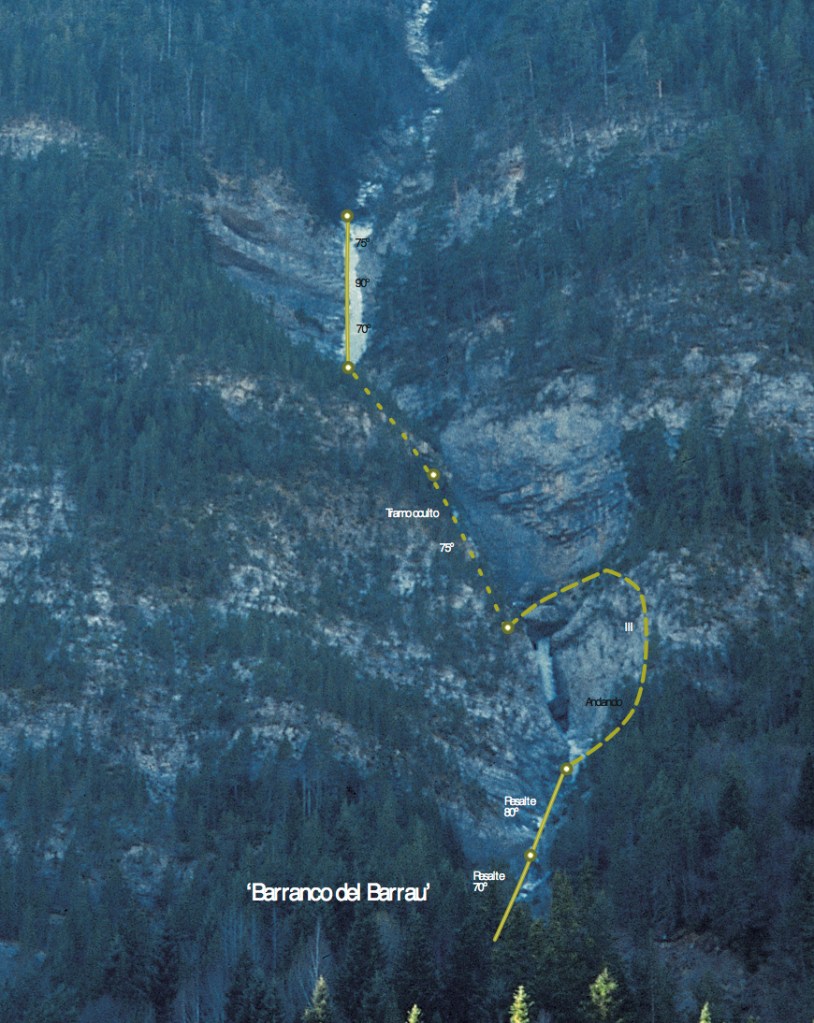Se trata de varios resaltes de hielo en un barranco que viene de las laderas superiores. En la reseña se puede leer: “Luna de mis noches tristes, luna de mi vanidad…” Material; cintas para los árboles. De 1 a 2 horas. Descenso mediante dos rápeles sobre árboles.