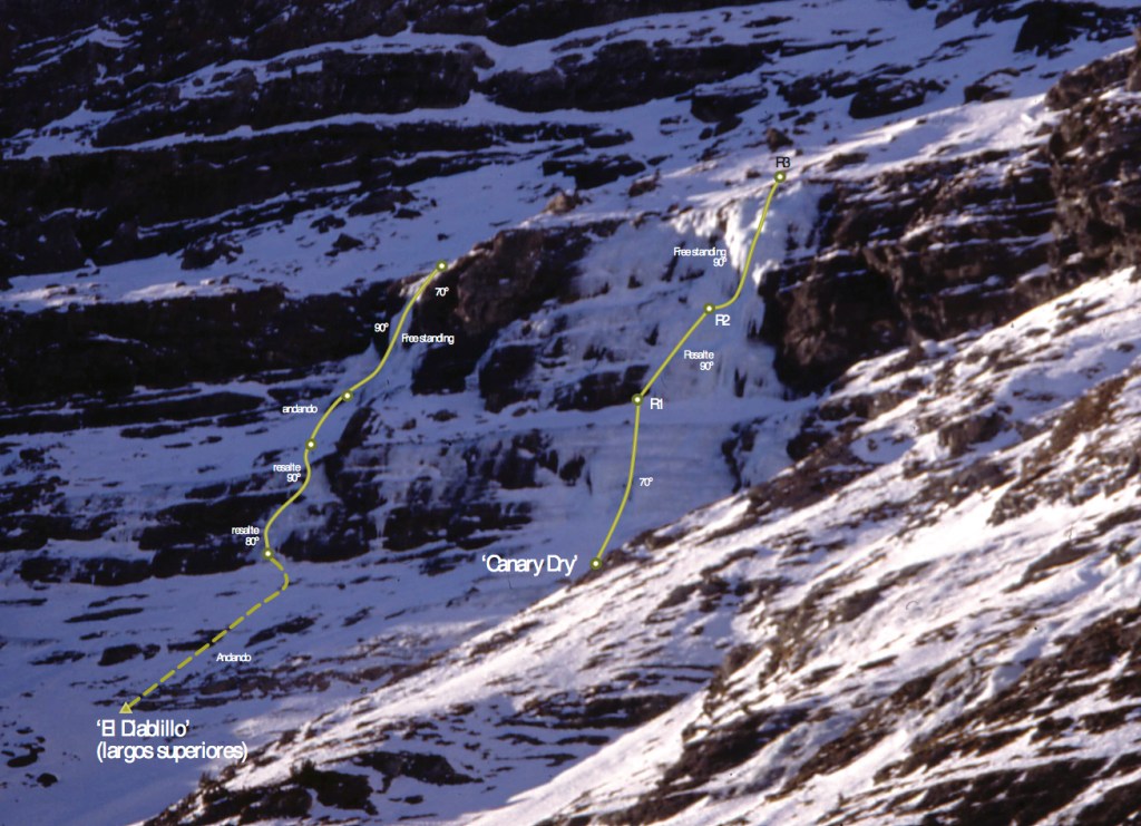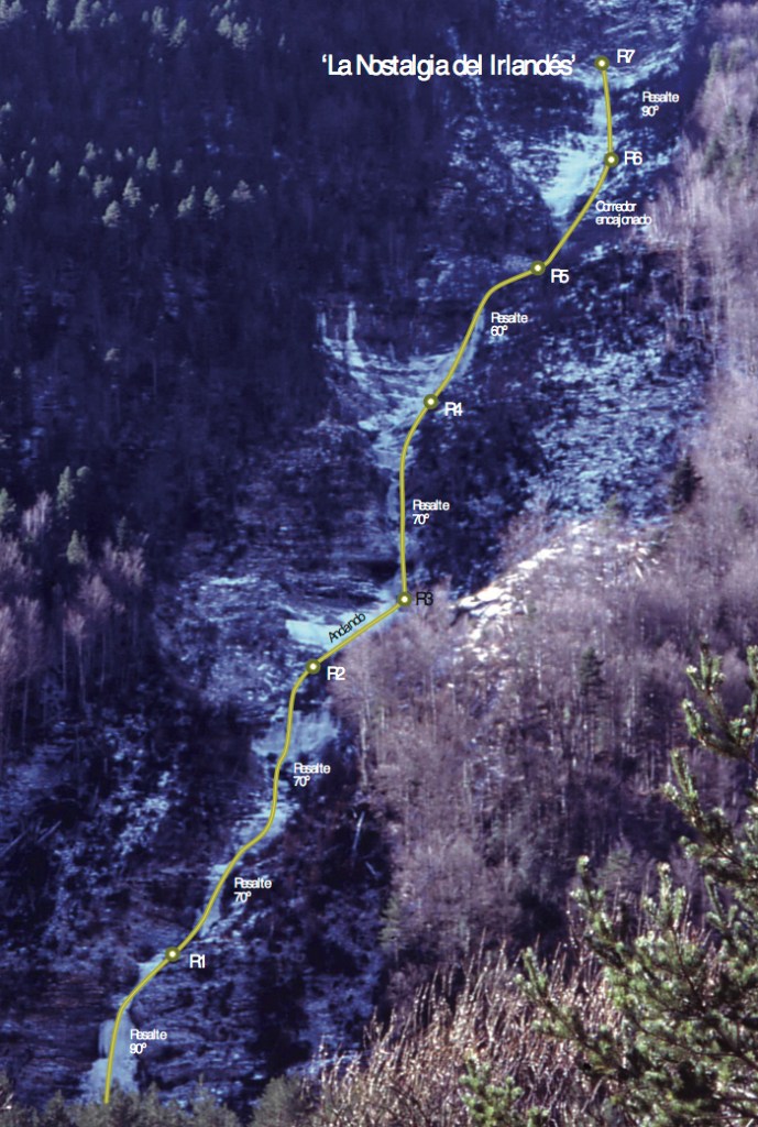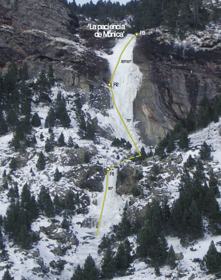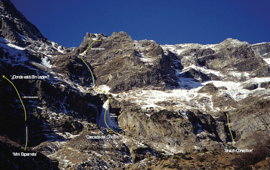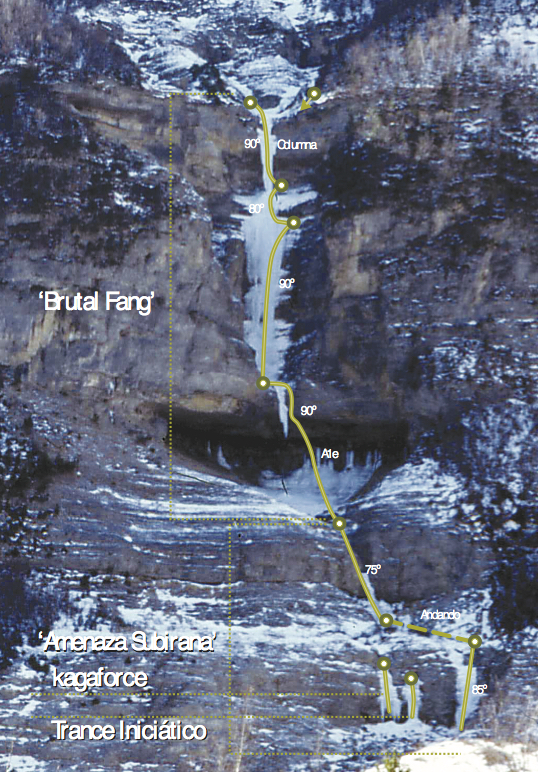 Sin duda la mejor cascada del valle de Pineta. Espectacular, elegante y difícil. Se puede acceder a la base escalando la “Amenaza Subirana”. Los aperturistas evitaron el largo de la cueva entrando por la izquierda en dos largos expuestos (M6 el 2º) con largos franqueos entre ellos y realizando posteriormente un franqueo de 80 metros y dos rápeles hasta la marmita sobre la cueva. El 31 de enero Oscar Cacho, Javier Bueno y Chiro Sánchez equipan los 35 metros del desplome de la cueva enderezando la ruta y dejándola preparada para escalarla en Dry-tooling extremo. El largo de la cueva está sin encadenar. Si se escala en artificial prever la utilización del piolet para poder enlazar los parabolts o una antena de las utilizadas en escalada deportiva. El que ahora sería el segundo largo es un muro de 40 metros de 90º, el tercero es una columna de 90º, se puede montar una reunión opcional a 15 metros del segundo largo.