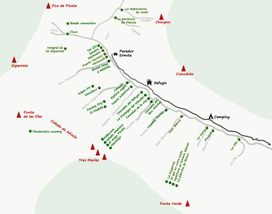 Para el escalador no hay nada más sabroso que sentir el gusanillo en el estómago de ir descubriendo las cascadas según se avanza por la carretera. En este caso casi todas las cascadas se encuentran en la vertiente norte del valle. Los tres primeros barrancos helados son quizás los más deseados, por su corto acceso y su estética, se trata de “El Pinaret”, “La Hoya” y “El Molín”, que nos dan la bienvenida con largos verticales entre marmitas, bosques y algún bloque empotrado. En lo alto se divisan las, hasta ahora, más famosas cascadas de la zona, las de las Tres Marías. Son cuatro cascadas de más de 100 metros de longitud que se encuentran en buenas condiciones la mayor parte del año, lo cual no quiere decir que se puedan escalar durante toda la temporada, ya que en todo cuento de hadas tenemos un ogro, el de Pineta se llama “Alud”, y tiene muy mal carácter… Una vez llegados a la altura del refugio de Pineta podemos divisar en lo alto del valle, como queriendo imponer su jerarquía, la “Canary-Dry”, la mejor cascada del sector del collado de Añisclo. A sus pies tiene tres nuevas aperturas de esta temporada 2004/2005; “El Diablillo”, “Demilanos” y “kique-Ice”. Siguiendo la carretera hasta el parador de Pineta podremos apreciar la joya de la corona, si es que ese año los duendes que regulan el caudal de los manantiales se alían con las olas de frío, se trata de la última y más espectacular cascada no sólo del valle, sino que casi nos atreveríamos a decir de todo el pirineo español: “Brutal Fang” es el nombre que le han dado sus aperturistas, Xavi Teixidó y Albert Salvadó, a una enorme cueva con colgado incluido, a la que siguen un precioso y mantenido muro de 90º con un último largo en columna para rematar el botín. Y como el botín es de tal magnitud no han faltado dos habituales de la zona para pedir su parte; Pako Sánchez que abrió en el 2001 los tres largos de entrada a la cueva, y Chiro López que se encargó de equipar el desplome para forzar en Dry-tooling.