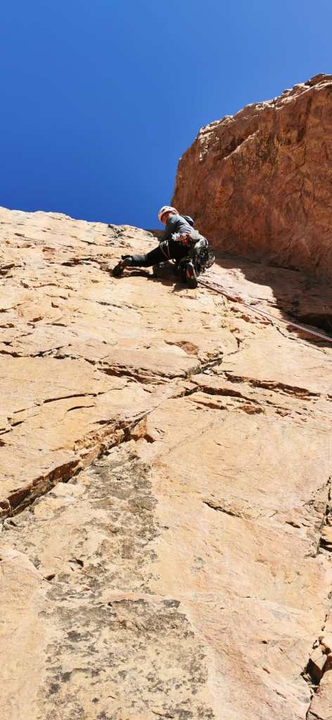 L4 45m, 5b. Atacar el muro por la izquierda hasta encontrar una laja que nos ayuda a superar las dificultades.
