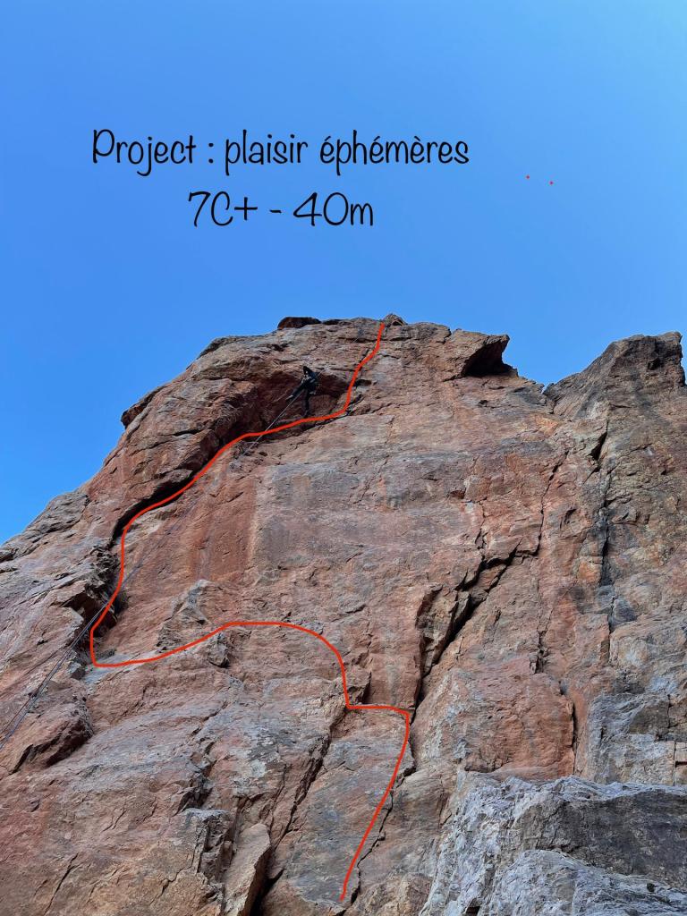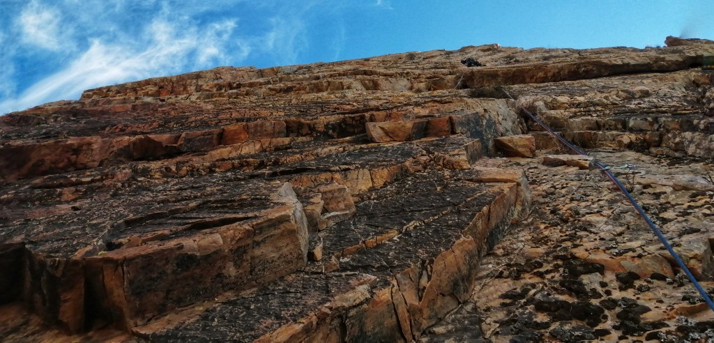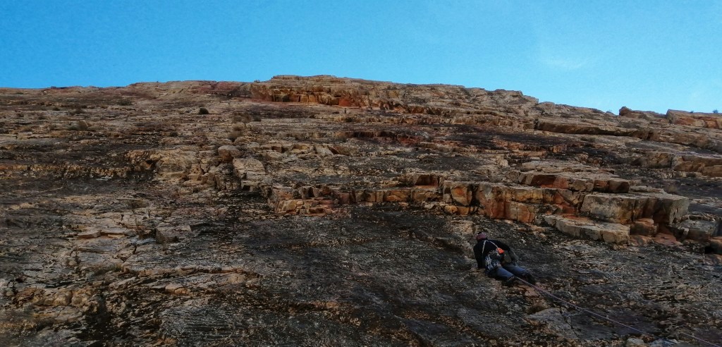 Con una dificultad aproximada de F7c+ podría haber sido una de las rutas más duras de Tafraout, pero no nos atrevimos con una dura sección de unos 10 metros en donde la protección era prácticamente inexistente, así que siguiendo la mentalidad «No pitons, No bolts», quedó pendiente de encadenar y sin duda se convertirá en un buen proyecto para mejores escaladores.