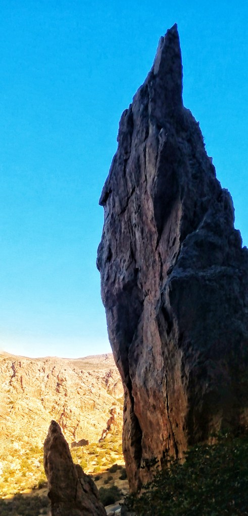 Tras la escalada del Flat Iron nos apetecía escalar una línea más dura, nos centramos en el Pinacle, concretamente en su cara Oeste, una pared de 50 metros desplomada con una fisura que rasgaba la anaranjada pared.