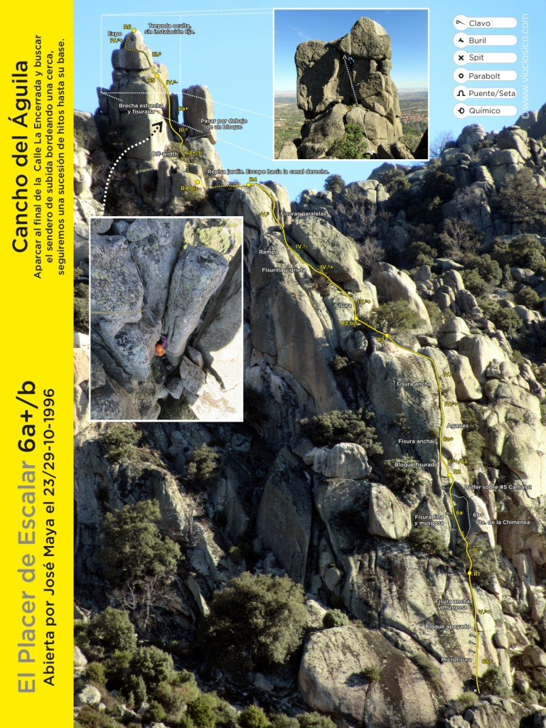 La ruta comienza en el balcón que existe justo debajo del marcado espolón de la Peña del Águila, a la izquierda de la conocida fisura del Capitán Pinzas. El primer largo transcurre por una microfisura de dedos que rasga la placa, para más tarde ascender por una fisura más ancha, el largo es muy bueno (algo sucio).