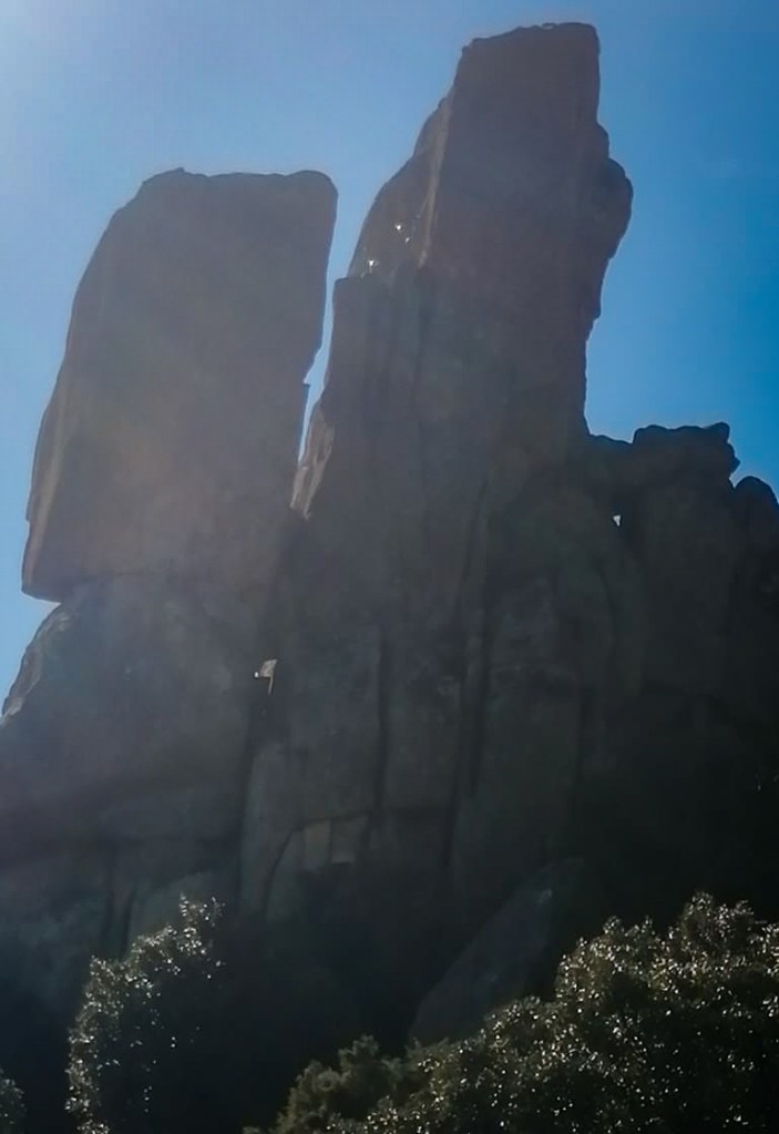 El siguiente largo es una trepada sencilla hasta la base del torreón final, para ascender éste por un curioso largo, de roca pobre (de dificultad variable según por dónde lo escalemos el Off-Width).