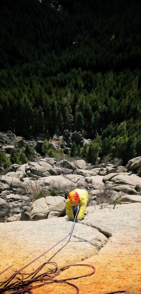 Como os he comentado anteriormente, el estético último largo, transcurre en travesía por unas fisuras paralelas para más tarde, salir en placa hasta la cumbre (tramo expuesto).