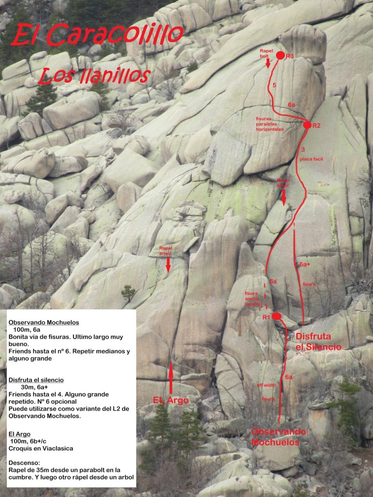 Bonita y agradecida ruta que comienza por un tramo de fisura «poco apetecible», para más tarde, darte la opción de ascender por dos trazados. El original, con un estética fisura arco, y la variante «Disfruta el Silencio«, por una provocadora fisura de manos (se protege muy bien).