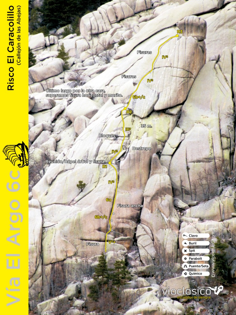 Las dos líneas existentes fueron abiertas por Joaquín Gracia con diferentes compañeros, la vía Argo, junto a Uge García y el resto, junto a Juan Luis Monje. Para mi gusto, una buena forma de abrir nuevas líneas, libres de material fijo, exceptuando aquellos pasajes improtegibles.