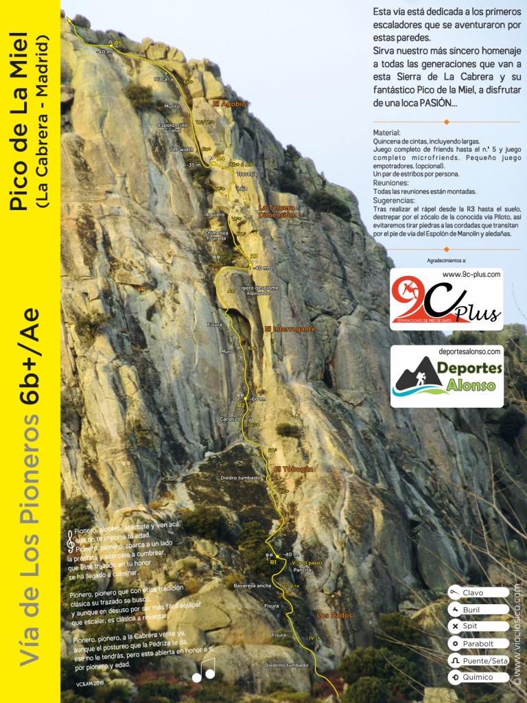 Esta vía está dedicada a los primeros escaladores que se aventuraron por estas paredes. Sirva nuestro más sincero homenaje a todas las generaciones que van a ésta Sierra de la Cabrera y su fantástico Pico de la Miel, a disfrutar de una loca PASIÓN…