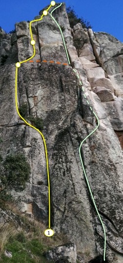 El primer largo escalaremos la marcada fisura y aéreo espolón de la variante Directa 6a, es una bonita línea que encontramos a la izquierda de la entrada original (bastante más sucia y sencilla), se encuentra prácticamente limpia (un clavo y un anecdótico cordino en una encina seca). La reunión está equipada para rapelar.