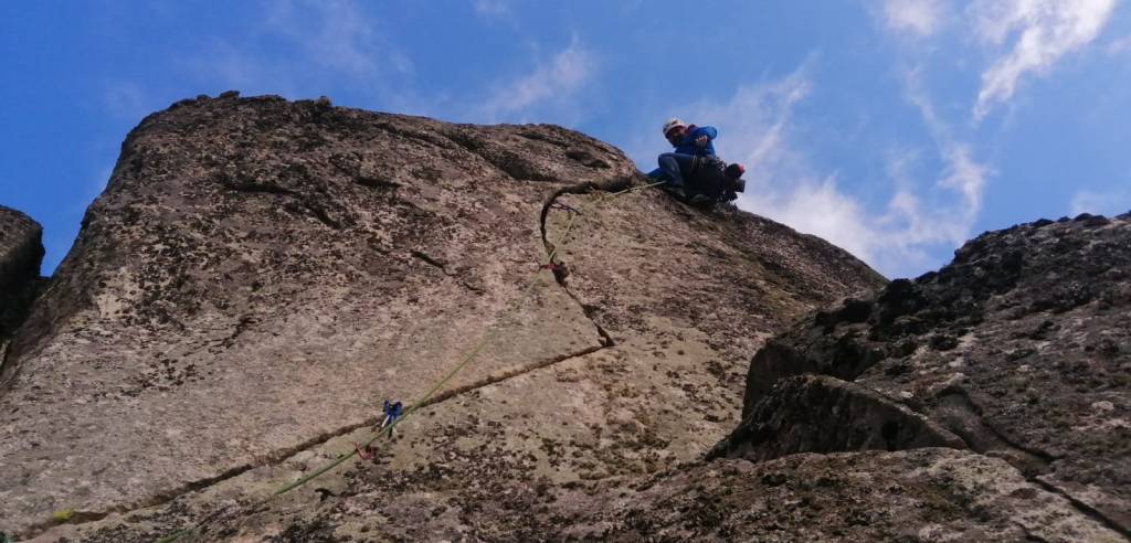 El cuarto largo supera un pequeño muro con dos fisuras paralelas, con un paso raro 6b.