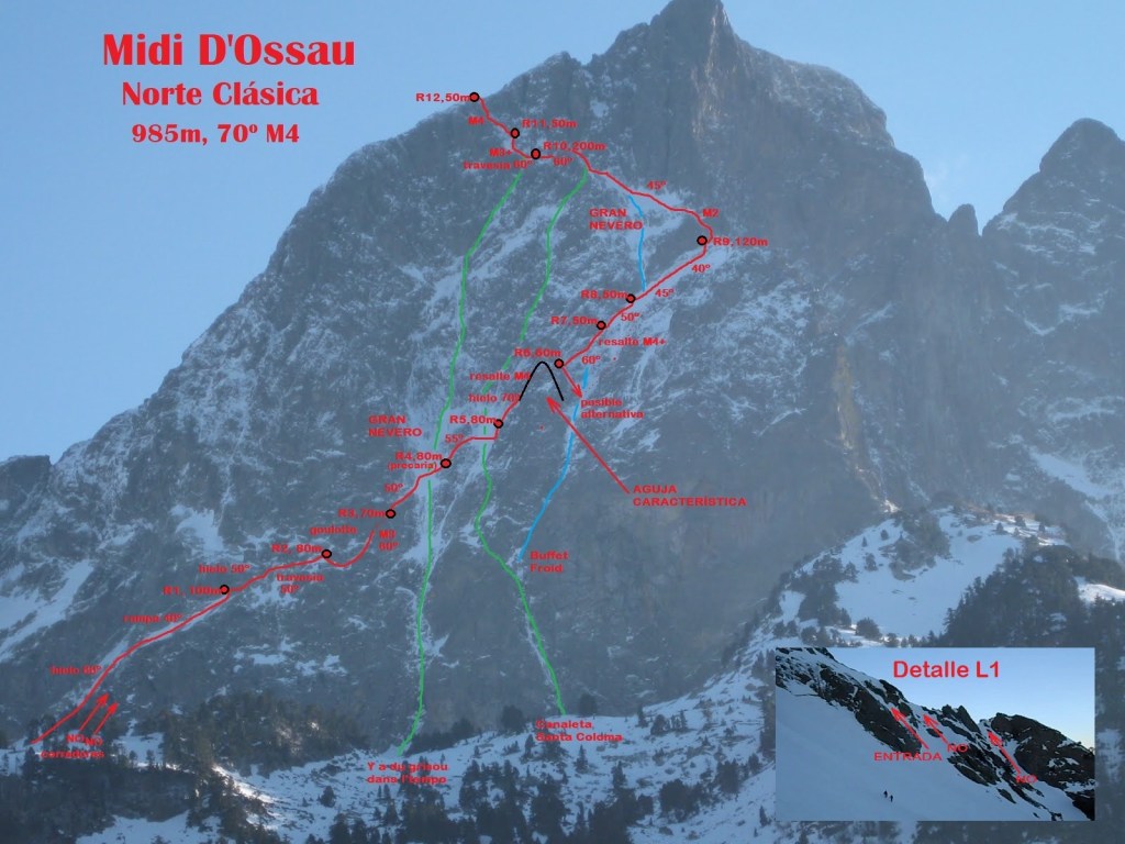 Debido a la poquísima y mala información que hemos encontrado de esta pared, hemos elaborado una reseña del trazado seguido en la Norte Clásica, intentando marcar los recorridos de las otras líneas de la zona (según la información que hemos podido conseguir).