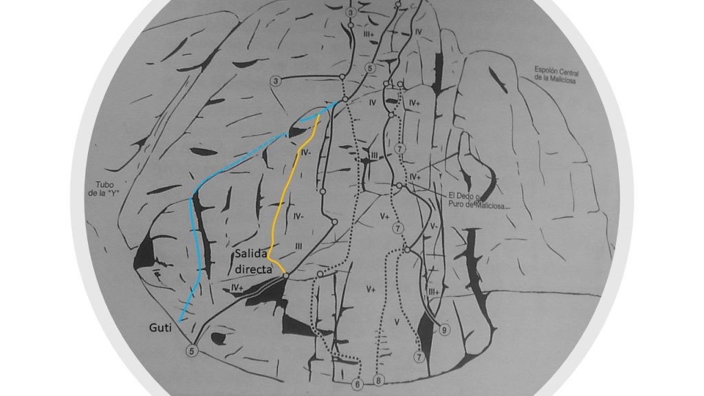 Descendimos desde la cumbre de la Maliciosa por el Tubo de todos (cuyas paredes se encontraban a sotavento y momentáneamente al sol), y escalamos el Gran Diedro, por donde el agua fluía.