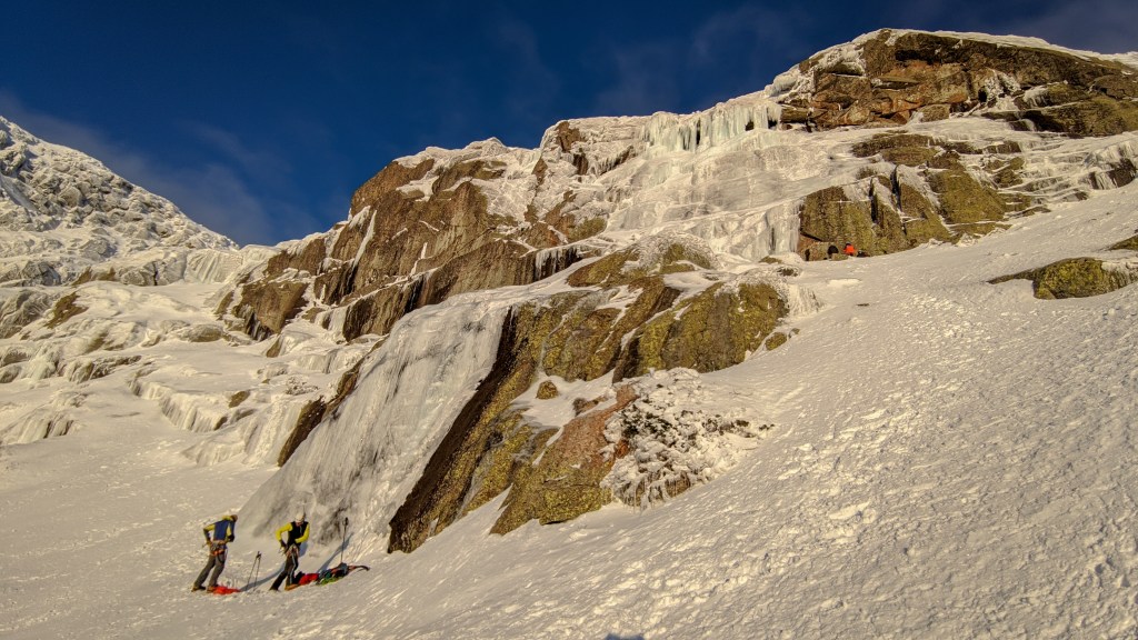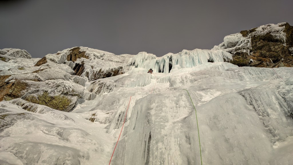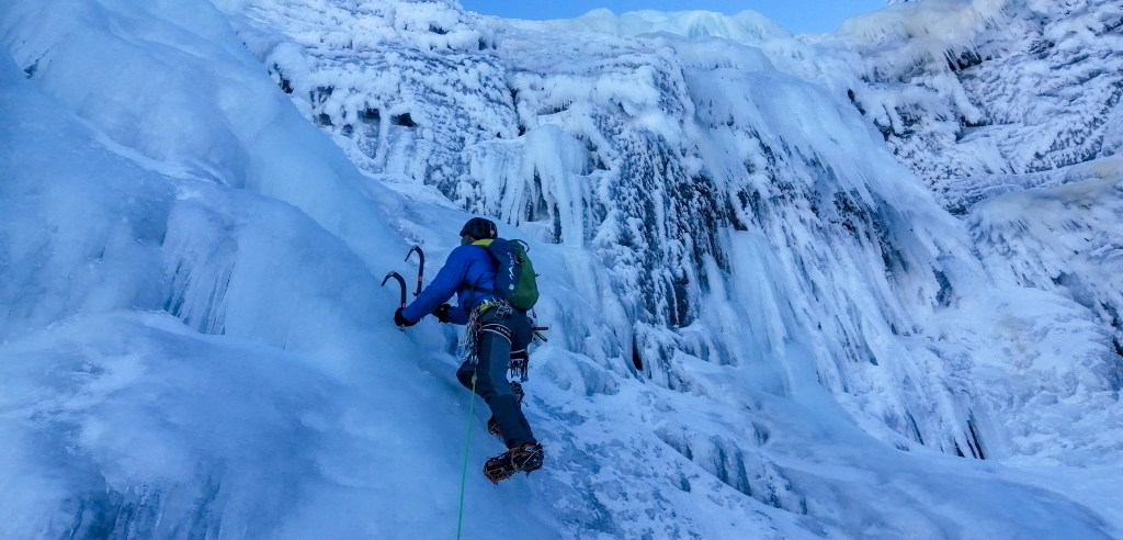 Teníamos ciertas dudas del estado en el que se pudiera encontrar la ruta, después de todo el día al sol (una vez más es cara Sur), pero nos llevamos una grata sorpresa al ver que el hielo estaba perfecto.