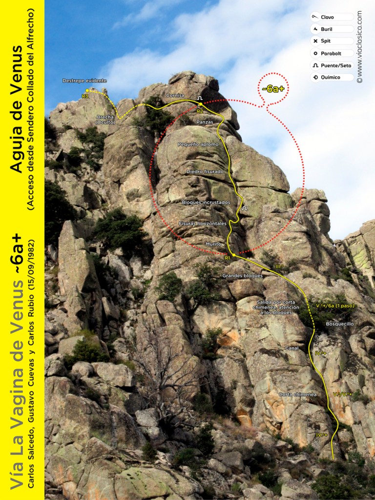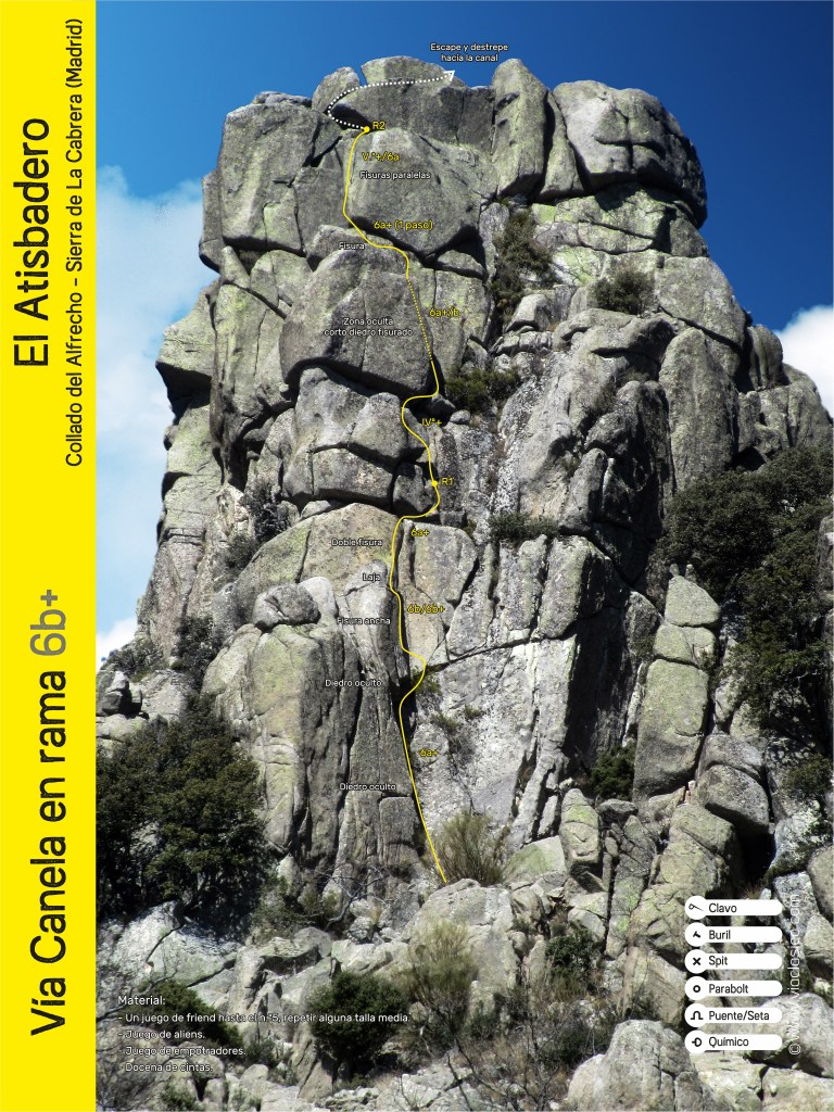 Es conveniente duplicar tallas medianas y portar un #5 de Camalot, la primera reunión se puede montar unos metros más arriba de la marcada en la reseña (la R1 da pocas opciones si no tenemos los números apropiados).