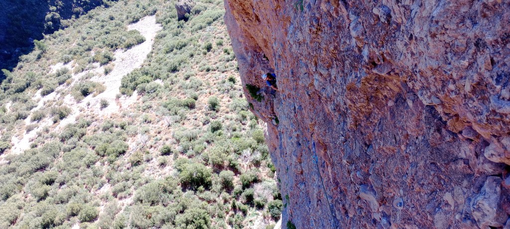 Realizamos la vía Mosquitos en dos largos de cuerda, la sensación de escalar acumulando metros y vacío, olvidándote por completo de tu compañero, en plena sintonía y fluidez, y total confianza, es la ostia.