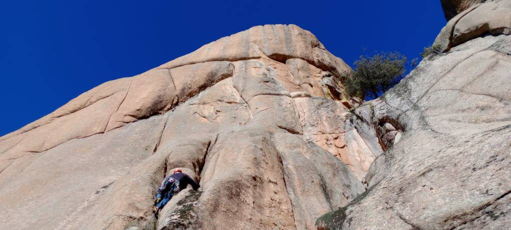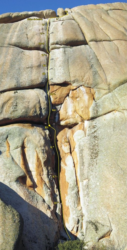 Preciosa fisura semiciega en su parte inicial (abierta por Eladio Vicente), situada a la derecha de la Goyo, son 30 metros de escalada muy variada y divertida.