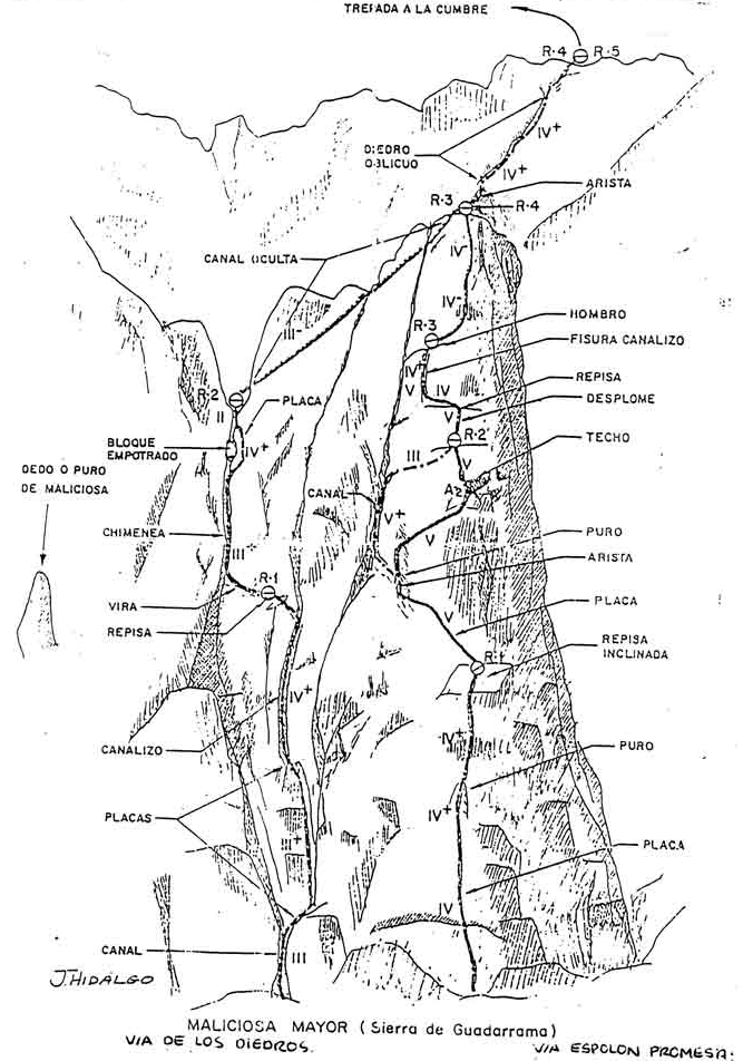 Tras superar un pequeño tramo de cresta, escalaremos el marcado Diedro diagonal (un clavo, V+), para ir a buscar el final de las dificultades.