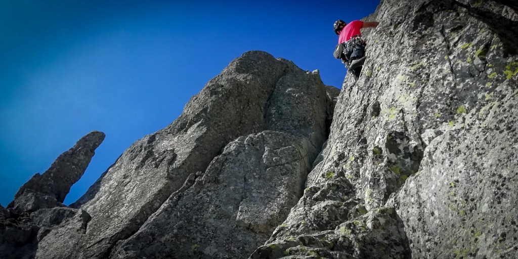 Retomamos el espolón mediante un paso duro en fisura (V+), para ir a buscar una corta pero marcada cresta aérea.
