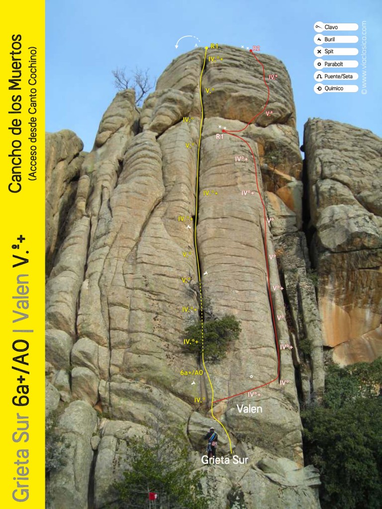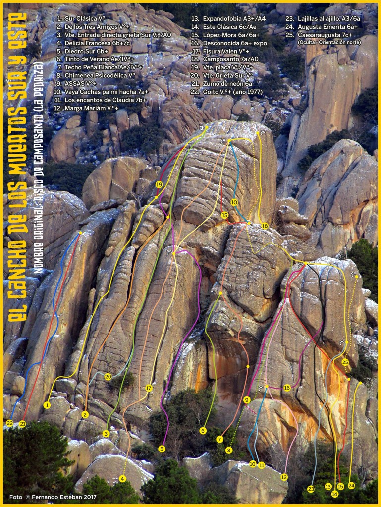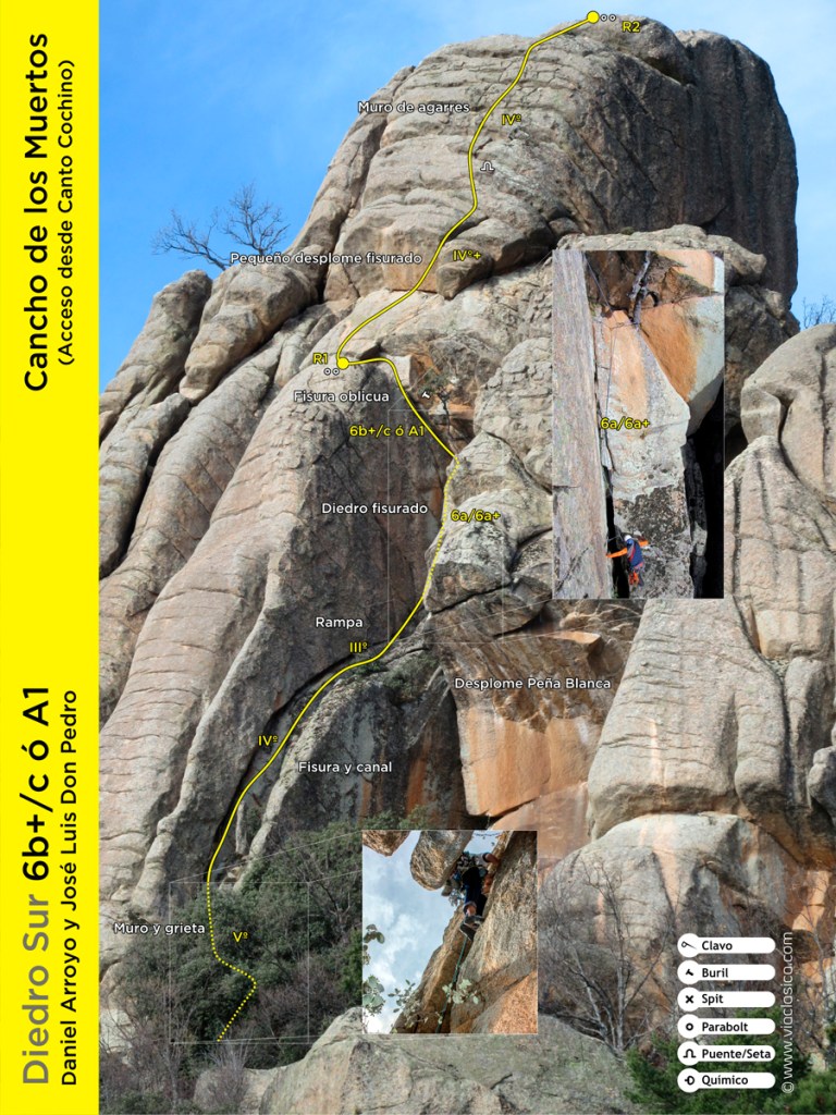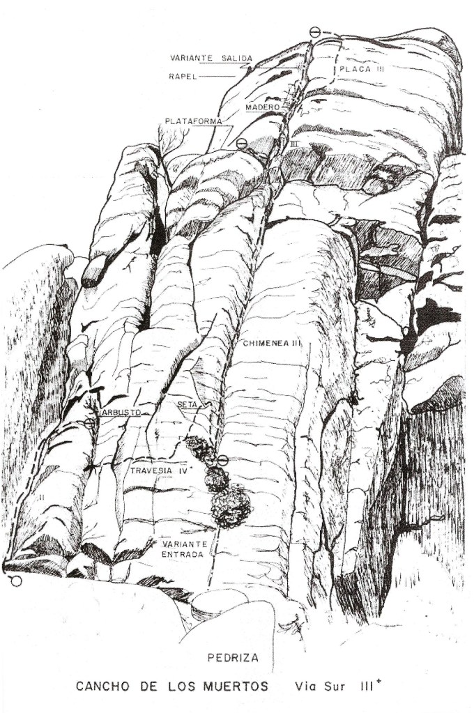 Con éste escueto nombre he intentado recopilar las diferentes formas clásicas de ascender hasta la cumbre del Cancho de los Muertos, existen vías de escalada por cada una de las fisuras-chimeneas características de la cara Sur.