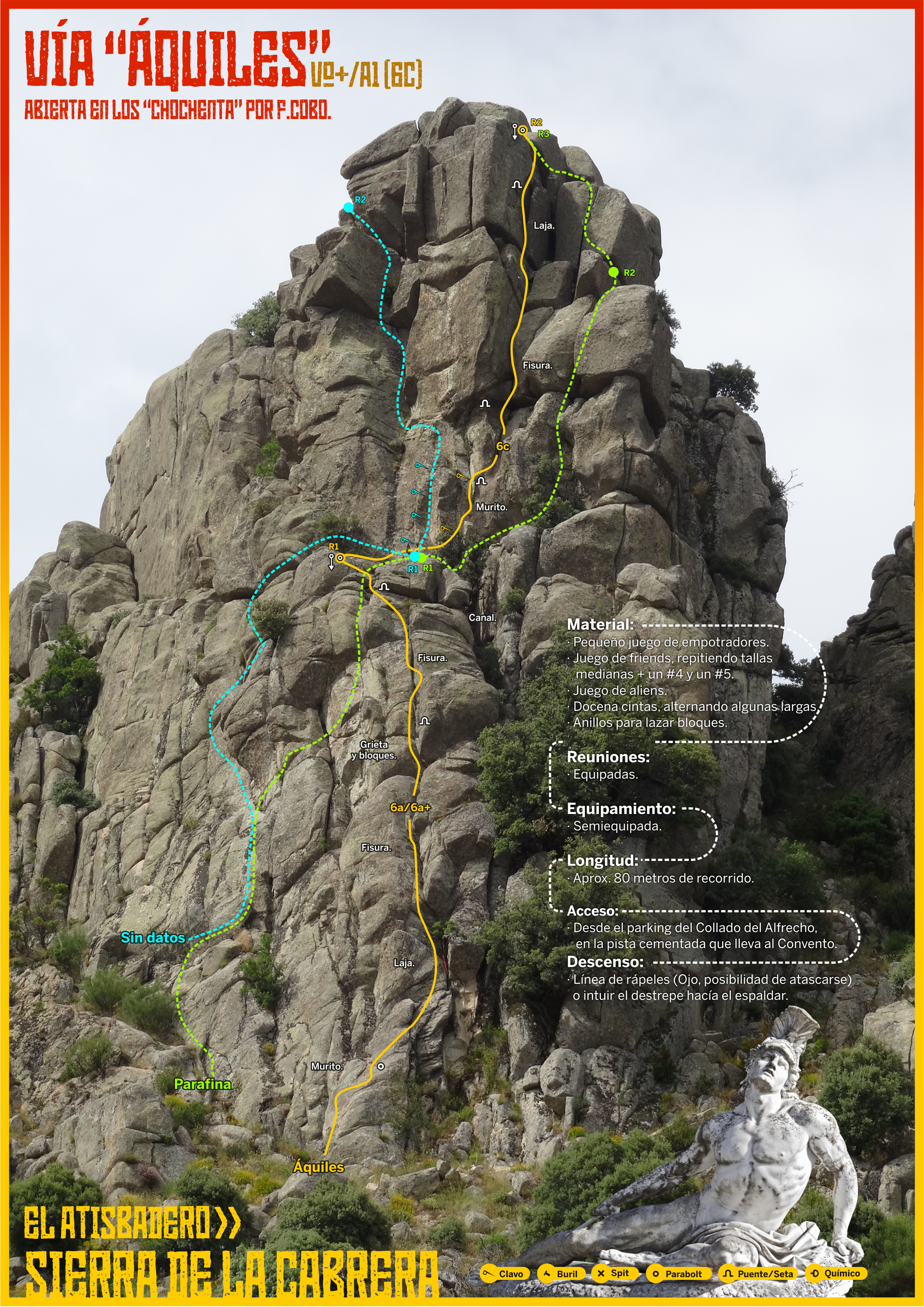 Habría que cambiar la historia de la mitología Griega, al hablar del padre de Aquiles en la Serranía de la Cabrera, Fernando Cobo fue el aperturista de ésta ruta de escalada, allá por los años 80.