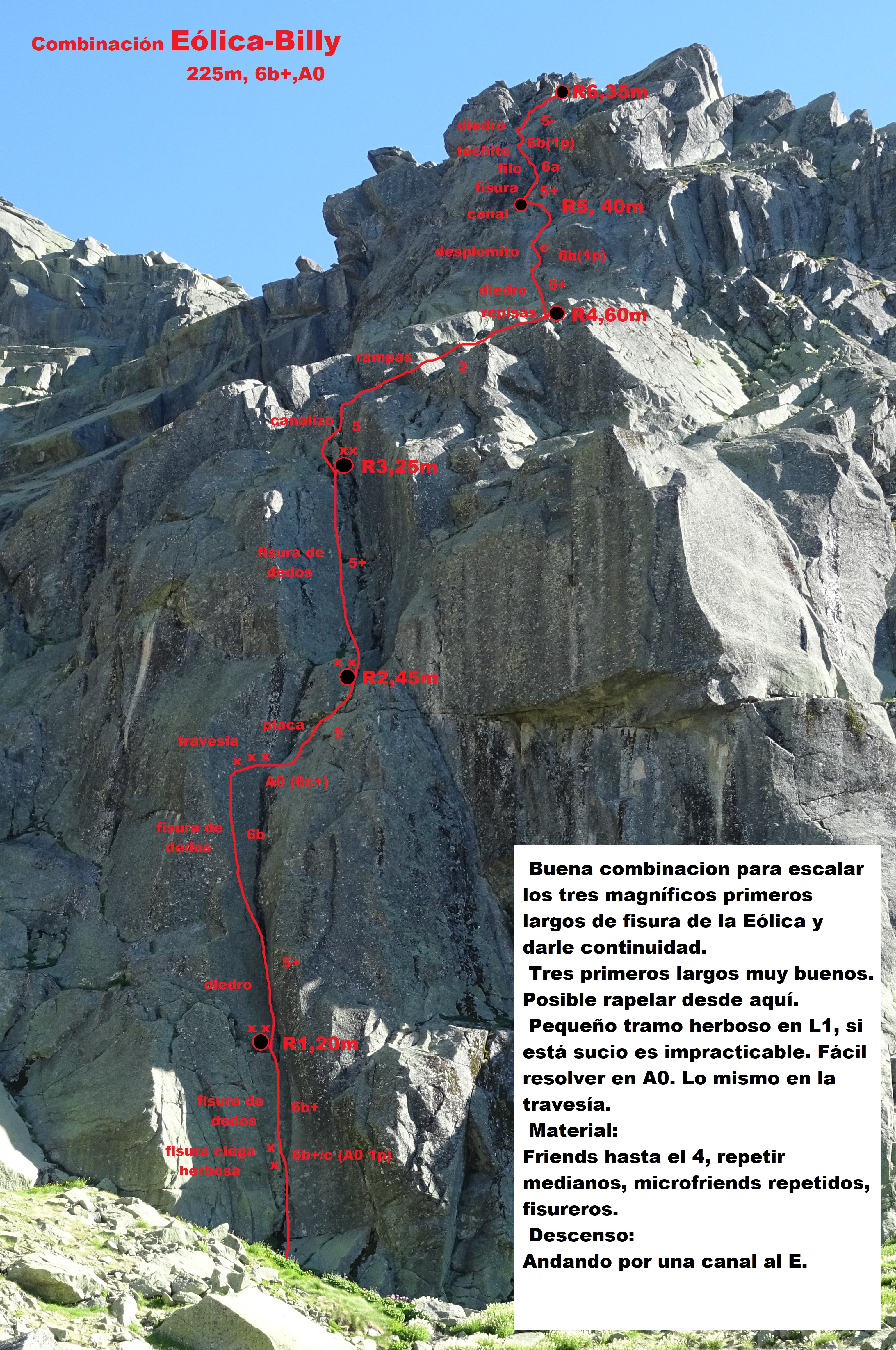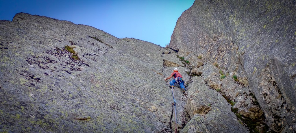 Diría que sus tres primeros largos de escalada (fisura de cerrojos de dedos y empotres) son de lo mejor de la sierra, en ocasiones el primer largo puede estar sucio y ser difícil liberarlo (aunque es de las vías de escalada que se suelen hacer).