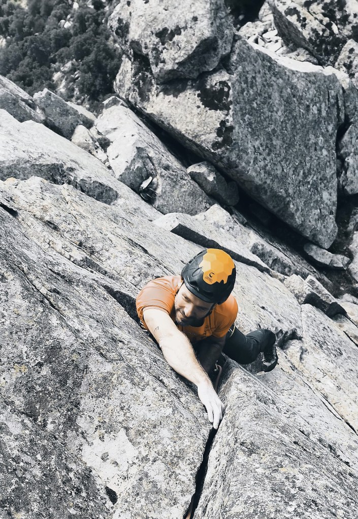 El segundo largo es una maravilla, una vertical fisura anaranjada (sorprende la adherencia de la roca) que da acceso a una zona de bloques antes de la gran repisa, que deberemos tantear con mimo.