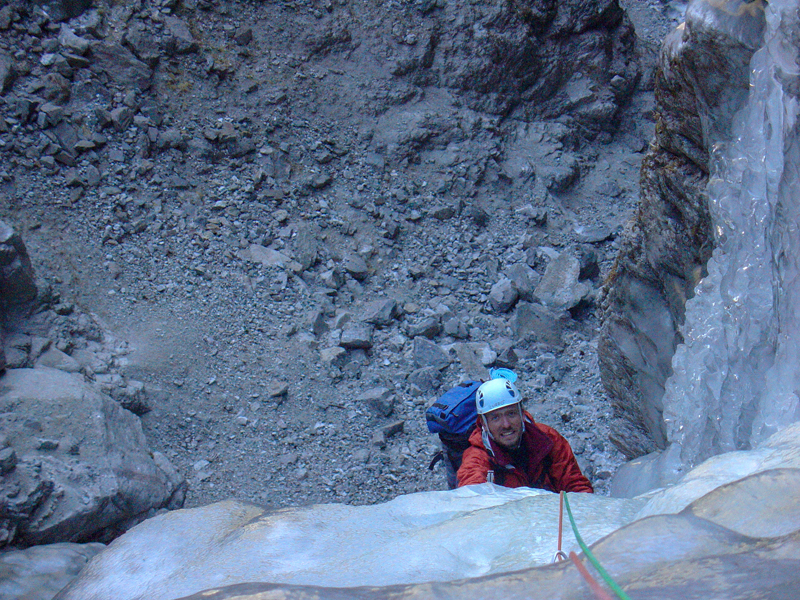 En tres largos de cuerda, máximo 85º, llegamos a un gran bloque; este lugar desde Namche se veía escaso, incluso no sabíamos a ciencia cierta si tenía conexión con la parte superior. Lo encontramos muy delicado; con un hielo quebradizo de estalactitas inconexas, superamos el muro en dos largos, 80º/85º. Continuamos hasta la base de otro muro, 70º/75º, que superamos en otros dos largos más, máximo 80º.