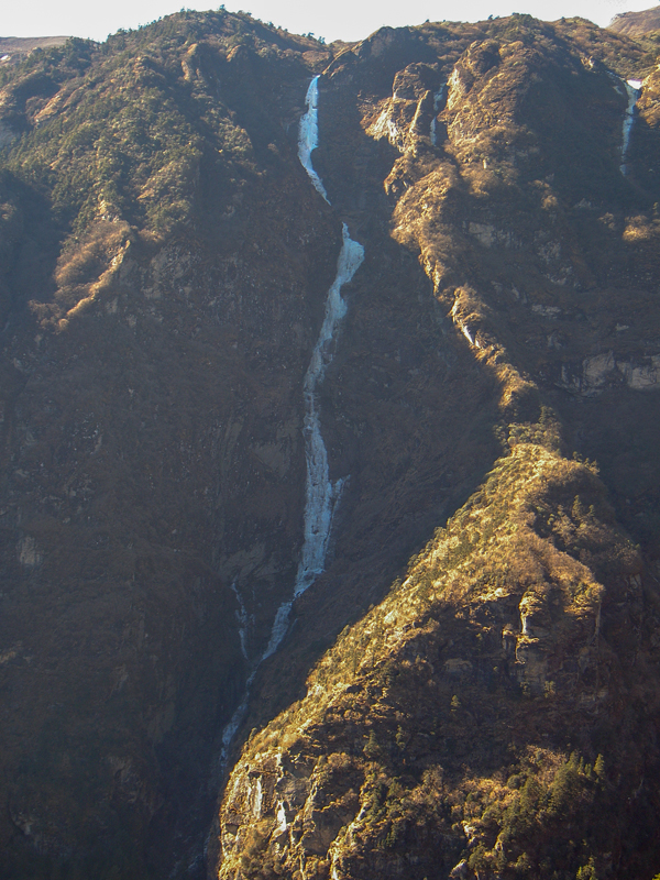 Los habitantes de Namche Bazar dicen que cuando, a finales de marzo, la cascada empieza a caer, es tiempo de la siembra de patatas. Nosotros no vamos a esperar que se venga abajo, y mientras comemos unas sabrosas patatas cocidas, observamos esta gigantesca línea de hielo.