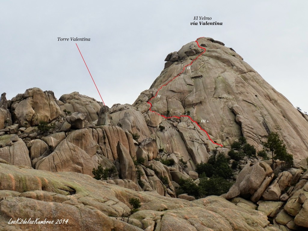 El ascenso al Yelmo lo realizamos por la conocida vía de escalada Valentina, una sencilla trepada que conviene asegurar con cuerda a neófitos en la materia (algún paso aislado expuesto).